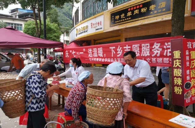 深切慰问老人,添彩生活晚晴。两个支部党员教职工自愿捐款筹集4000元,为印江县木黄镇敬老院捐赠大米40袋共800斤,食用油20桶共200斤。全体人员一对一给老人做健康咨询、现场答疑,医护人员认真给敬老院的老人测量血压和血糖,建立健康档案。“关注关心老年生活,是全社会的共同责任。我们现在做的,只是略尽绵薄之力,为老人们带来一点点心意,我们希望他们晚年健康幸福!”李黔军说。深入社区义诊,传递健康理念。全体人员不畏酷暑,积极为赶集群众免费测量血压。同时,为着力凸显我院“大健康”办学理念,医务人员积极向群众提供健康咨询服务,全面讲解日常疾病预防、家庭必备药品、健康护理、治疗政策等知识,党员干部们纷纷向赶集群众发放宣传单,全面传递大健康生活理念。活动历时2小时,共检测血压500余人,提供疾病咨询服务1800余人次,发放大健康及新冠肺炎疫情防控宣传资料1000余份,受宣群众达3000余人次。参观红色基地,提升党性修养。全体人员参观了红二、六军团木黄会师纪念馆,认真听取了讲解员的介绍,感受老一辈革命家的坚韧意志、为民情怀和远大理想。随后又前往会师纪念碑处,在庄严、肃穆的会师纪念碑前,怀着崇敬的心情三鞠躬,郑重地齐举右手,面对党旗庄严宣誓,接受党性再教育。