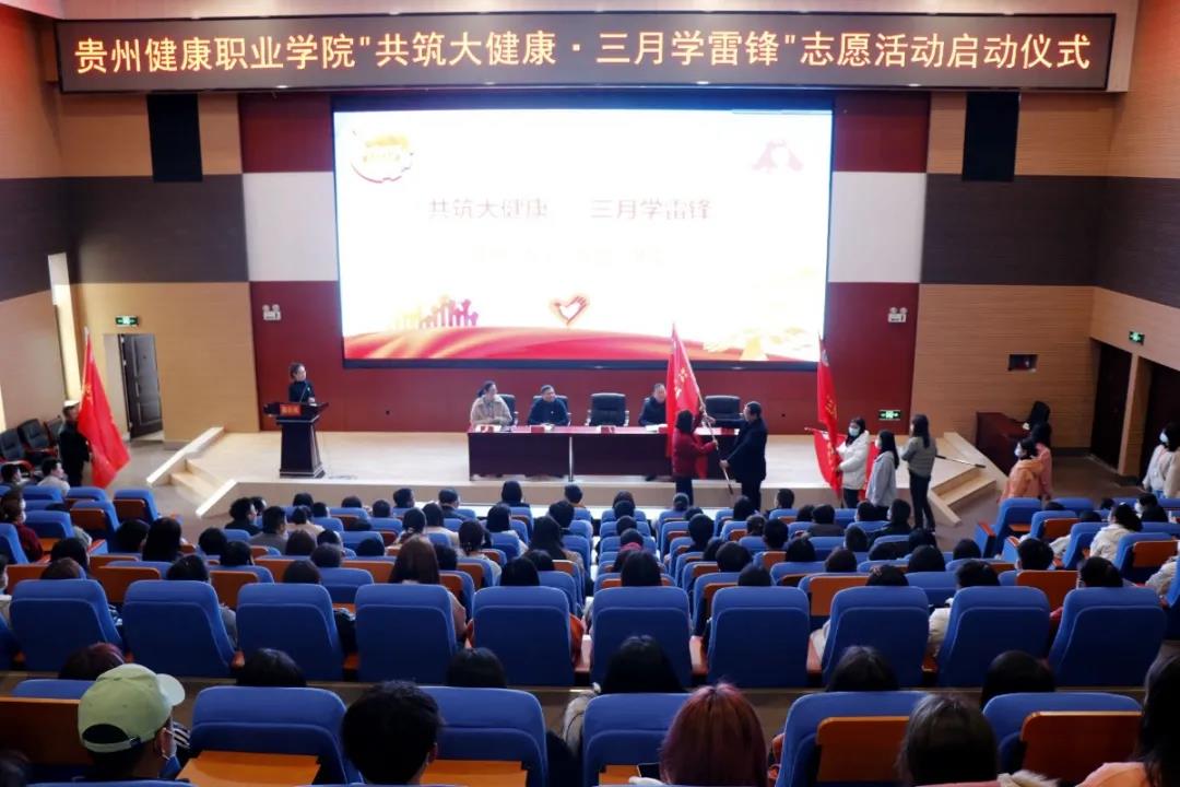 在学术报告厅举行的志愿活动月启动仪式上,学院党委副书记李黔军分别为机关党总支、护理系、药学系、健康管理系等志愿服务队授旗。党委委员、党政办主任王晶韵出席,学生处、后勤处、招就处、规划财务处等部门负责人,学院机关党总支全体党员、团委全体人员以及护理系、药学系、健康管理系志愿服务队员共计300余人参加启动仪式。