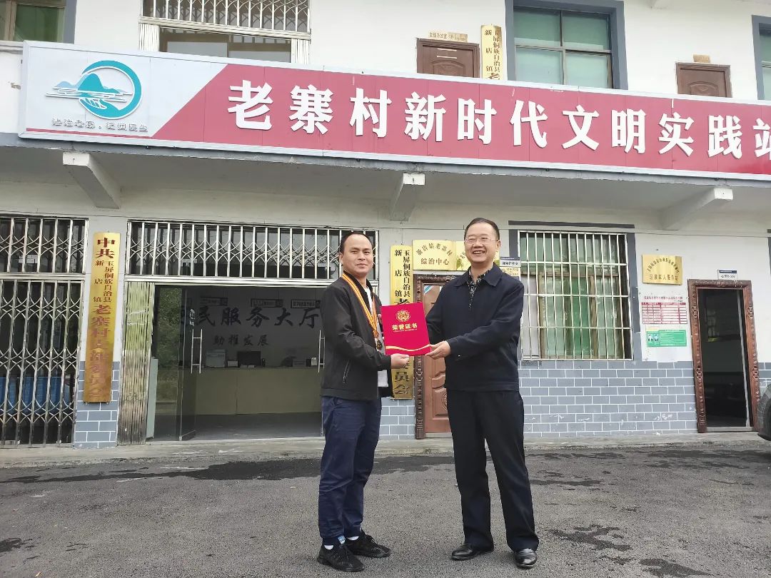 获此好消息,10月18日,党委副书记、院长吴国才率学院党委委员、工会主席王锡林,工会副主席、保卫处处长吴鹏程一早出发,特意赶往玉屏县新店镇老寨村,上门为曾小俊颁发奖章和奖证。