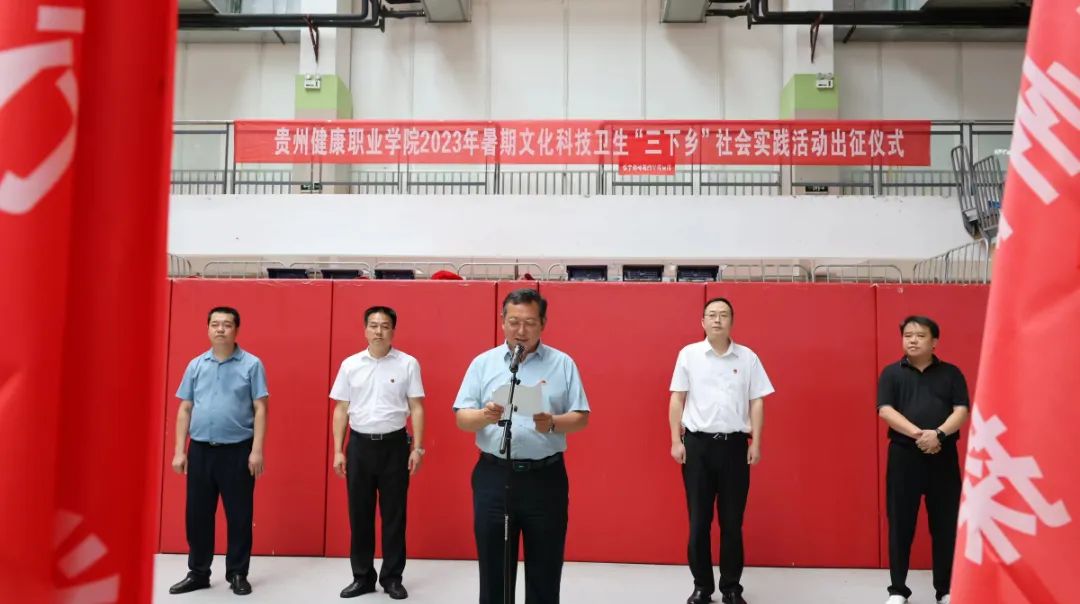 6月30日,我院在体育馆举行2023年暑期“三下乡”社会实践活动出征仪式,院党委副书记李黔军出席仪式并讲话,院党委委员、党委办主任王晶韵,护理系、健康管理系、中医药系负责人参加。仪式由团委书记张铭峰主持。