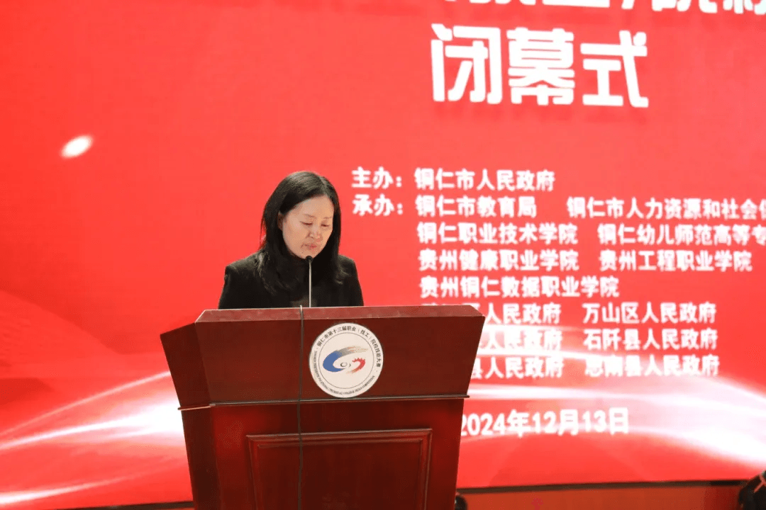 12月13日晚,铜仁市2024年第十三届职业(技工)院校技能大赛闭幕式在beat365举行。学校党委书记刘维佳,党委副书记、院长吴国才,铜仁职业技术学院党委委员、副院长王锋,铜仁幼儿师范高等专科学校党委委员、副校长谭欧阳 ,市人社局党组成员、市就业局局长甘馨芳,市委教育工委委员、市教育局党组成员、副局长叶通贤出席闭幕式。吴国才主持闭幕式。