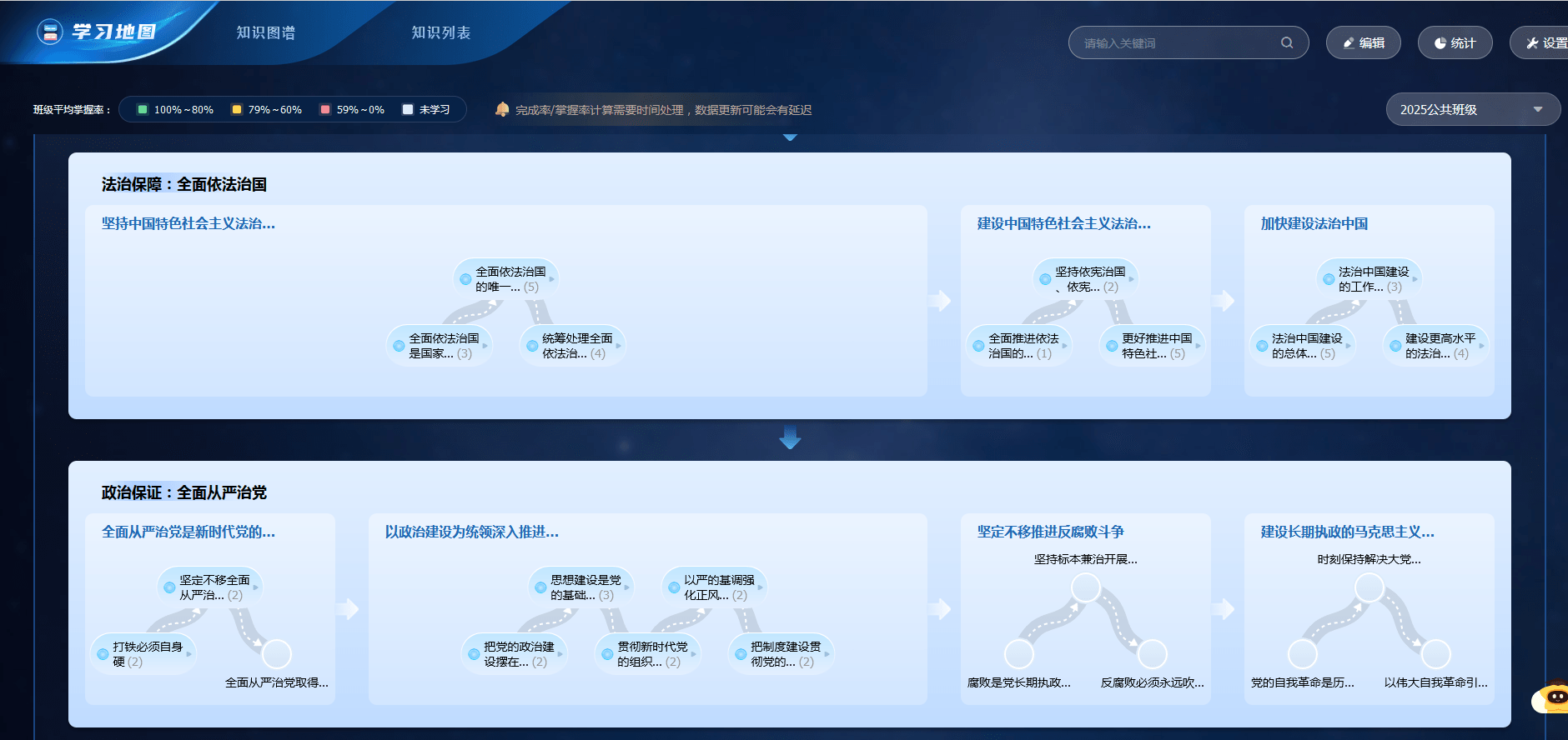 学习地图助力教学提质增效。课程团队根据教材框架和知识逻辑,建设了学习地图,学生可以依据学习地图的知识脉络进行学习。同时,可以帮助教师清晰掌握学生知识学习完成率和掌握率。