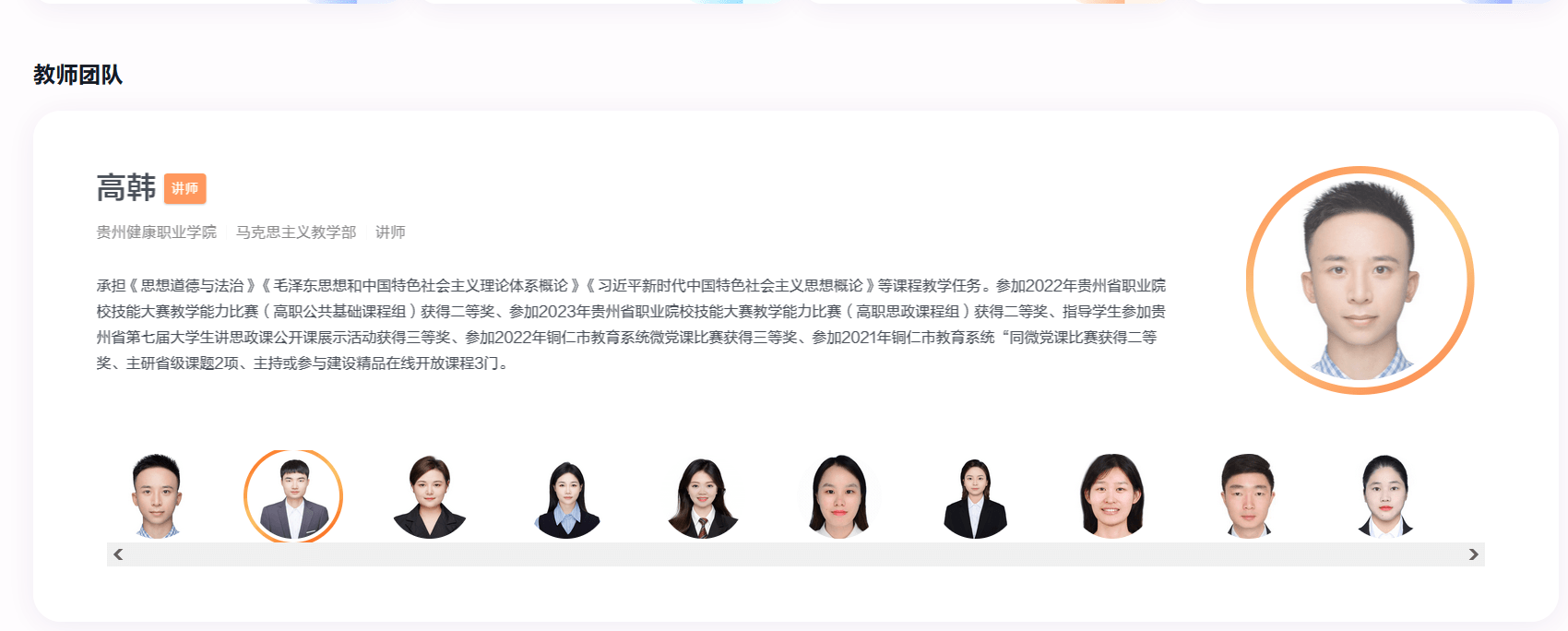 本课程团队共10人,副教授1人,讲师7人,助教2人。课程团队成员先后获得2022年贵州省职业院校技能大赛教学能力比赛(高职公共基础课程组)二等奖、2022年贵州省大中小学思想政治理论课教学展示活动二等奖、2023年贵州省职业院校技能大赛教学能力比赛(高职思政课程组)二等奖、2024年贵州省青年教师教学能力比赛(思想政治课专项组)三等奖等奖项。