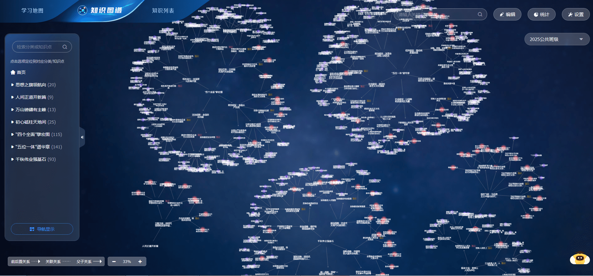 知识图谱构建课程新形态。课程团队深入分析课程教学内容及学生学习需求,从教材体系和教学体系两个角度出发构建知识图谱。图谱共分为六个模块,包含416个知识点,关联教学资源338个,关联习题355个。