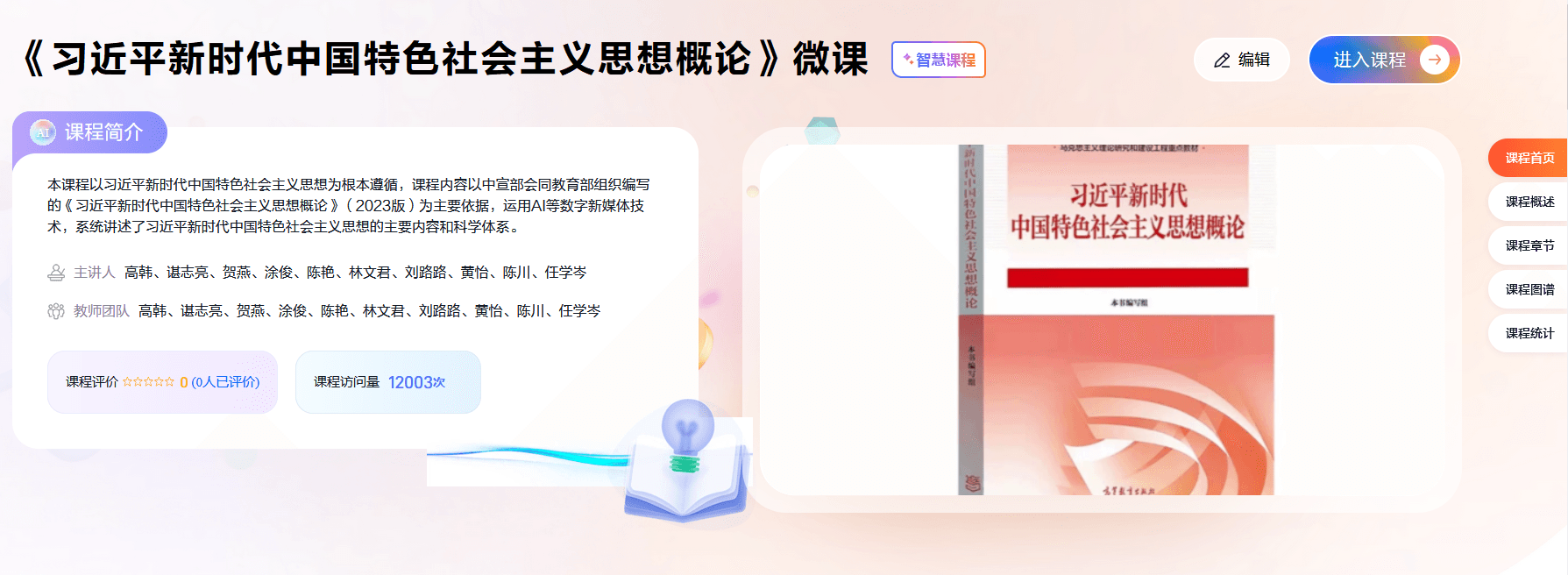 《习近平新时代中国特色社会主义思想概论》是思想政治理论课核心课程,是思想政治理论公共必修课。课程开设的主要目的是帮助广大青年大学生全面深入准确学习领会和把握习近平新时代中国特色社会主义思想,更好地认识中国特色社会主义新时代、认识新时代党的理论创新、认识在党的创新理论指导下党和国家事业发展。