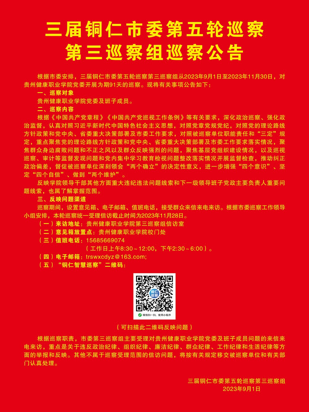 三届铜仁市委第五轮巡察第三巡察组巡察公告