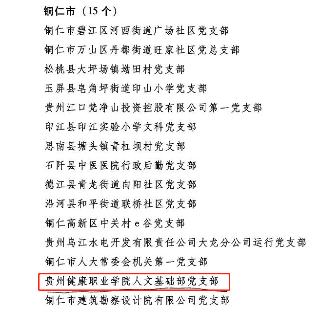近日,中共贵州省委党的建设工作领导小组命名了一批全省党支部标准化规范化建设示范点,我院人文基础部党支部喜获此项殊荣,成为全省199个示范点之一。
