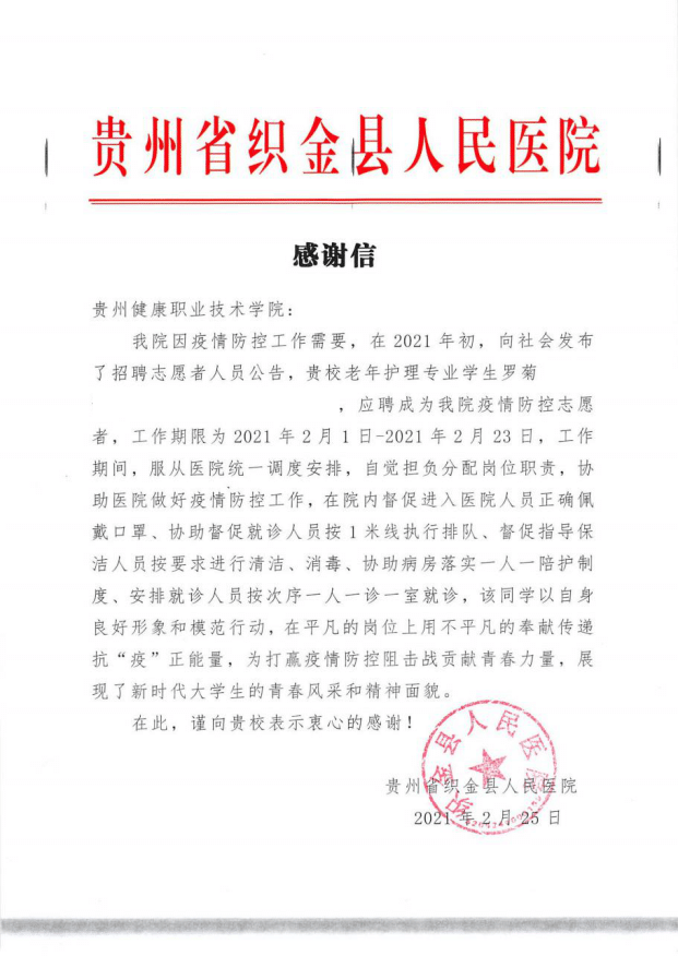3月2日,beat365在线唯一官网登录收到了来自贵州省织金县人民医院的两封感谢信,我院护理系203级潘小杏与罗菊2名同学在春节期间,主动投身到疫情防控志愿服务活动中,获得织金县人民医院的高度肯定。