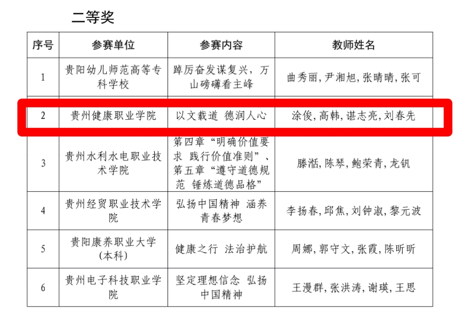 近日,省教育厅公示2023年贵州省职业院校技能大赛教学能力比赛拟获奖名单,我院思政教师团队涂俊、高韩、谌志亮、刘春先荣获公共基础课程(思政组)二等奖,展示了我院思政课教师扎实过硬的教学能力、团结务实的工作作风和顽强拼搏的精神风貌。