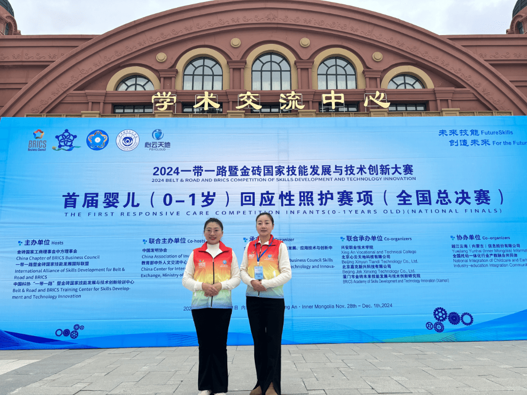11月28日-12月1日,由金砖国家工商理事会中方理事会、“一带一路”暨金砖国家技能发展国际联盟、中国科协“一带一路”暨金砖国家技能发展与技术创新培训中心主办的2024“一带一路”暨金砖国家技能发展与技术创新大赛首届婴儿(0-1岁)回应性照护赛项(全国总决赛)在内蒙古自治区兴安职业技术学院成功举办。我院教师赵平英、吴艳茜分别获教师组一等奖和二等奖;韩彩霞教师指导的学生严丽华、王露明分获高校组二等奖和三等奖;麻瑶娟教师指导的学生蒋雨欣获中职组三等奖;我院获教师组最佳组织奖、高校组优秀组织奖。