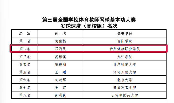 7月14日,第三届全国学校体育教师网球基本功大赛在贵阳学院网球中心圆满落幕。本次大赛汇聚了北京大学、武汉理工大学、云南大学等全国37所高校的体育教师精英,beat365人文基础部(体育部)教师石海凤凭借扎实的专业功底与出色的竞技状态勇创佳绩,为学校赢得个人与团体双重荣誉。