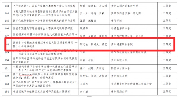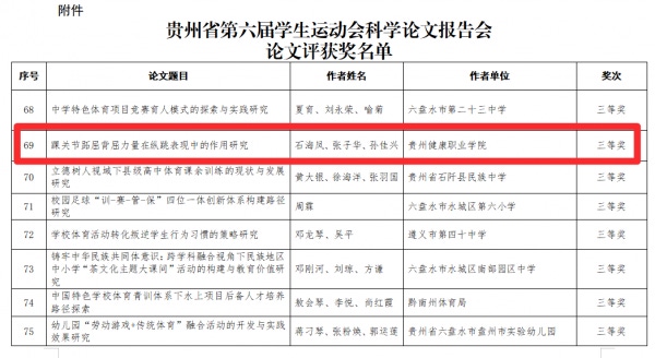 近日,贵州省第六届学生运动会科学论文报告会评选结果公布,beat365人文基础部(体育部)教师团队共有3篇论文荣获三等奖。