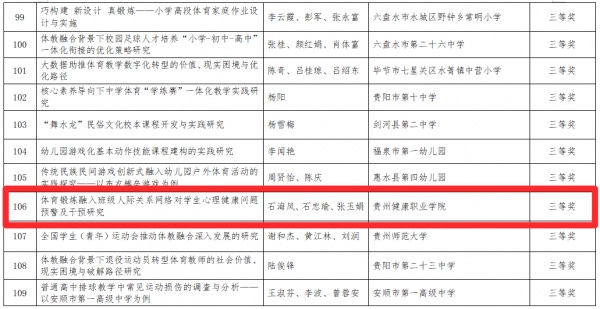 获奖论文分别为石海凤、孙佳兴撰写的《踝关节跖屈背屈力量在纵跳表现中的作用研究》;石海凤、石忠瑜、张玉娟撰写的《体育锻炼融入班级人际关系网络对学生心理健康问题预警及干预研究》;石忠瑜、石海凤、黄艺撰写的《体育参与对易地扶贫搬迁学生的人际关系重构研究——基于社会网络视角》。论文聚焦青少年体质健康、体教融合实践、体育心理干预等现实议题,研究设计严谨,数据详实,具有较强的理论价值与实践意义。