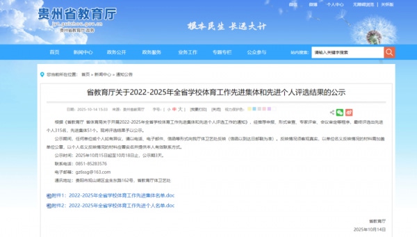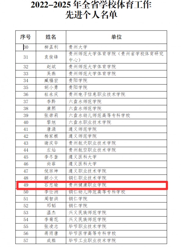 近日,贵州省教育厅公示2022—2025年全省学校体育工作先进集体和先进个人评选结果,beat365在线唯一官网登录人文基础部(体育部)荣获“全省学校体育工作先进集体”称号,教师石忠瑜荣获“全省学校体育工作先进个人”称号。