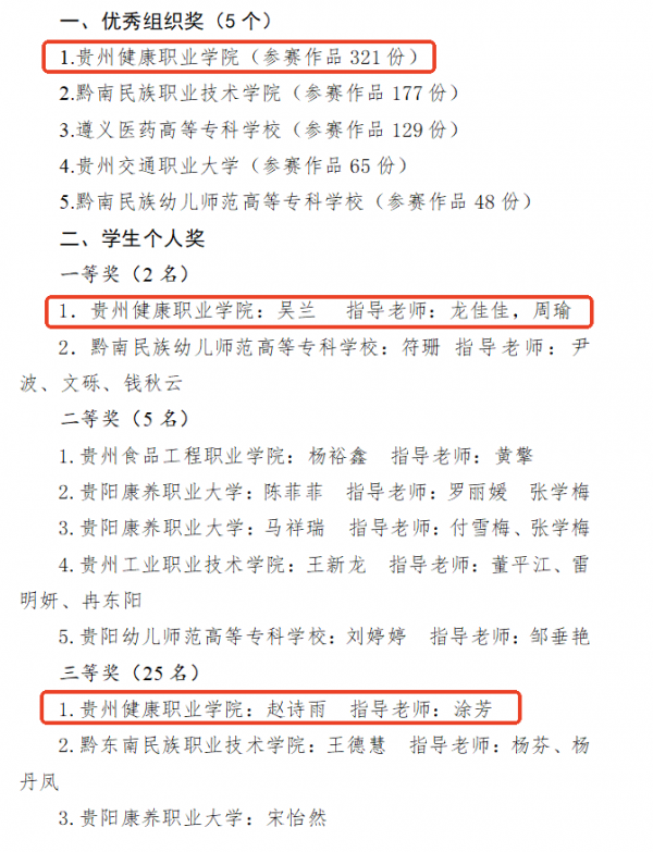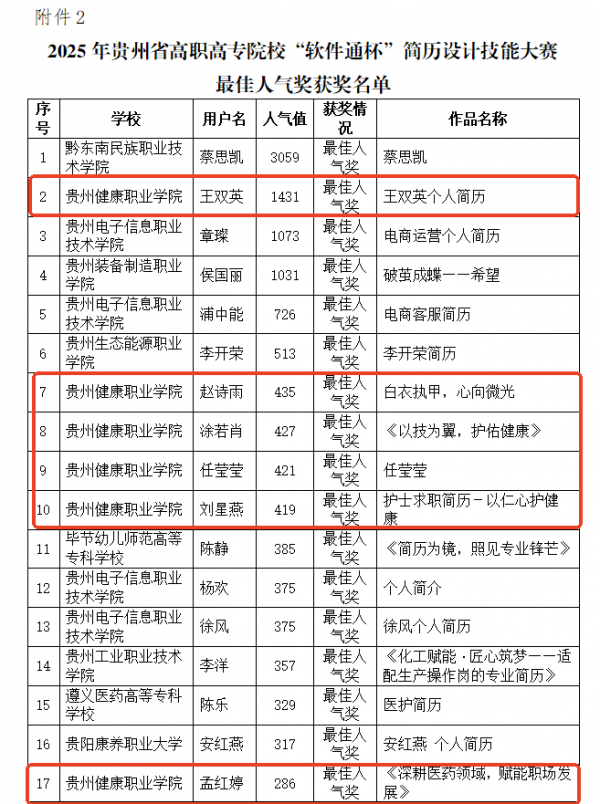 近日,由贵州省图书馆学会主办的2025年贵州省高职高专院校“软件通杯”简历设计技能大赛圆满落幕。beat365吴兰同学荣获一等奖,赵诗雨、刘星燕、田小雪、李雨佳荣获三等奖,孙莹等15位同学荣获优秀作品奖,王双英等8位同学荣获最佳人气奖,龙佳佳等8位老师荣获优秀指导老师奖,学校荣获优秀组织奖。