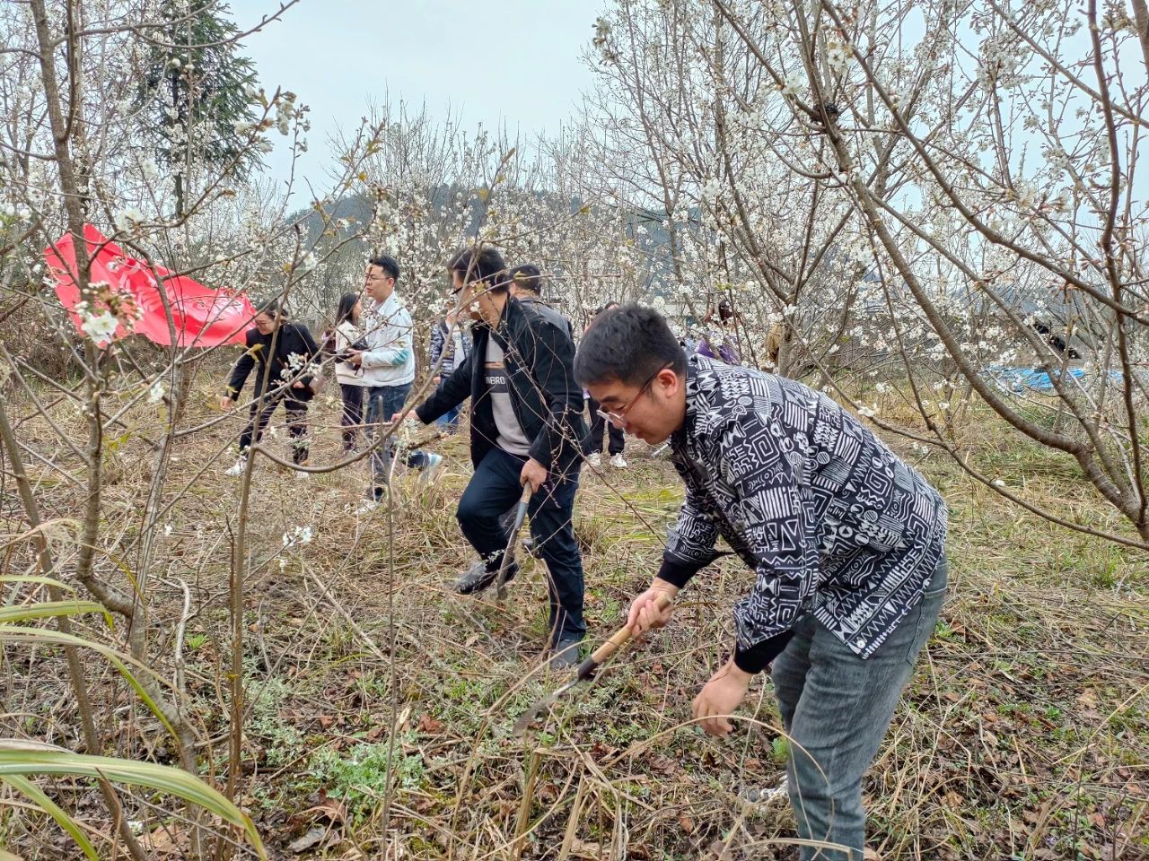 春来万物齐发,雪白花树下,杂草和灌木也竞相争春,初到果园时脚下会刺藤挡道,茅草遮身。大家撸起袖子、齐头并进,把杂草和藤蔓一一清理。劳动中,刺儿会扎进手指,叶边会割破掌心,但这些都抵不过整理后的果园给大家带来的喜悦。整洁干净的樱桃园,花气卷着草木香,浸染了果农的笑脸。