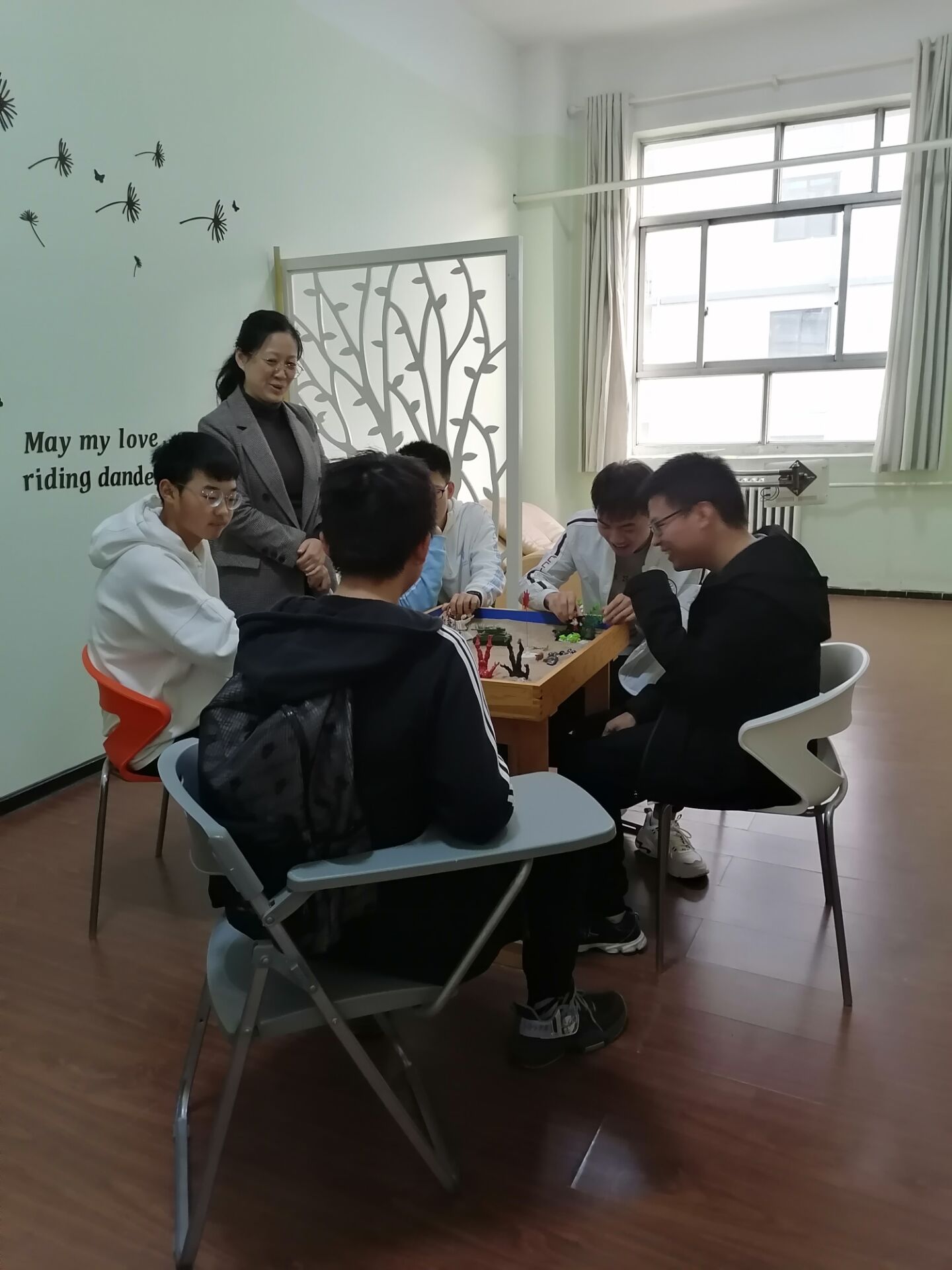 心理咨询中心主任安伯欣老师首先带领同学们参观了心理集中讨论室、心理咨询室,介绍了舒缓音乐治疗的过程,同时也普及了大学生心理健康基本知识和各级心理站点。参观过程中,同学们针对不同心理健康相关知识进行了讨论,大家积极参与、各抒己见。最后,安老师带领同学们体验了沙盘并进行了详细的讲解。至此,本次活动圆满结束。