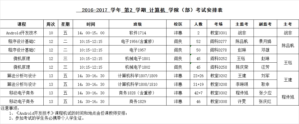 九游体育官网2016-2017-2学期考试安排(14周之前)