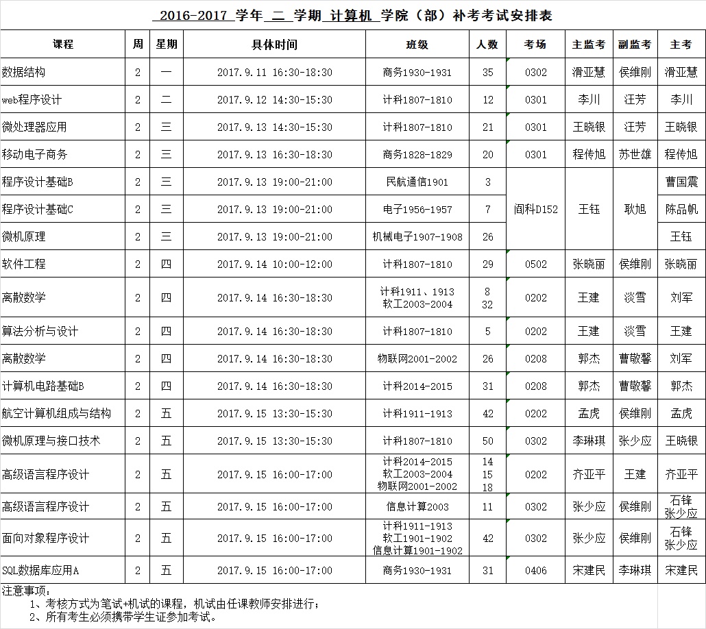 九游体育官网2016-2017-2学期课程补考安排表