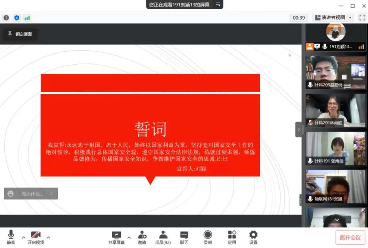 随后,围绕“国家安全与我”,师生党员代表结合疫情防控形势、社会安全、政治安全、文化安全和网络安全等方面,交流了学习习近平总书记关于总体国家安全观重要论述的心得体会。大家一致表示,在新冠肺炎疫情肆虐的严峻时期,这个全民国家安全教育日显得尤为重要。维护国家安全不仅仅是专门机关的任务,而是所有国家机关、社会组织和公民的义务和职责。在疫情防控中,每一名党员更应该履行好自己的职责,坚守在自己的岗位中,自觉践行总体国家安全观,筑牢国家安全防线。最后,全体师生党员庄严宣誓:永远忠于祖国、忠于人民,始终以国家利益为重,坚持党对国家安全工作的绝对领导,积极践行总体国家安全观,遵守国家安全法律法规,练就过硬本领,锤炼品德修为,传播国家安全知识,争做维护国家安全的忠诚卫士!