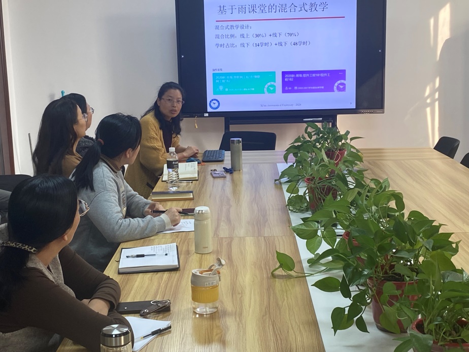 曹敬馨首先介绍了会议的流程及本学期开展混合式教学的四门课程的基本情况。然后分别由《程序设计基础》课程负责人曹敬馨、《数据库原理及应用A》团队成员张少应,《操作系统》课程负责人李美蓉,《软件工程》课程负责人张晓丽,从课程的教学设计、实施过程及存在的问题等方面介绍了各自课程混合式的开展情况。